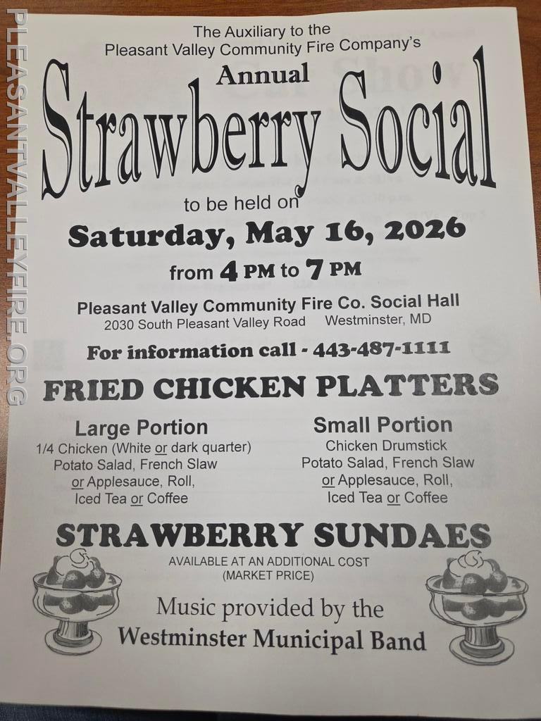 Our annual strawberry social will be held on May 16th from 4 pm to 7 pm at the fire house social hall. Come out and enjoy a fried chicken platter along with strawberries and ice cream. Music is provided by the Westminster Municipal Band.