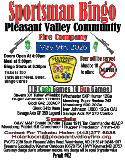 Pleasant Valley Community Fire Company will be hosting our annual Sportsman Bingo on May 9th, 2026.